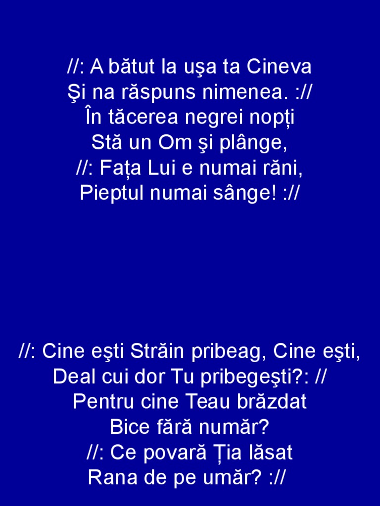 Faţa lui e numai răni pieptul numai sânge. A batut la usa ta cineva si n a raspuns nimenea. Cine eşti străin pribeag. De a cui jale pribegeşti.
