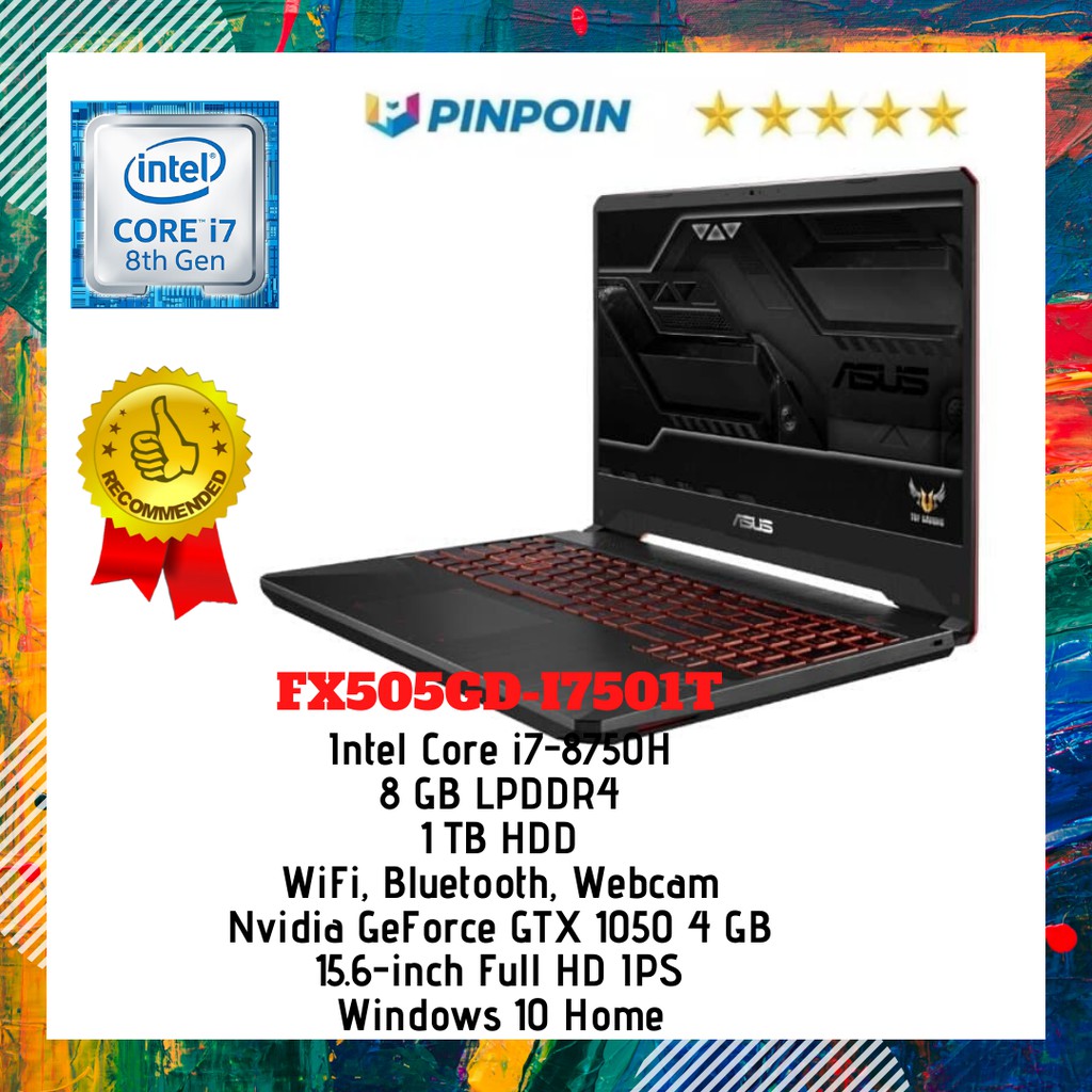 The asus tuf gaming fx505 is without a shadow of a doubt one of the best mid range gaming laptops you ll find in stores in the second part of 2018 and onwards. Asus tuf gaming fx505gd i7501t intel coffee lake 8th hexa core i7 8750h 2 2ghz up to 4 1ghz 9mb cache 12 threads intel hm370 express chipsets 8gb ram ddr4 1x slot available 1tb hdd 7200rpm intel uhd grapchis 630 nvidia geforce gtx1050 4gb ddr5 128bit windows 10 home 64bit. Asus tuf gaming fx505dv is bundled with the latest tuf gaming accessories. Asus gaming fx505gd i5501t i5 8300h 8gb 1tb gtx1050 4gb w10 tuf.
